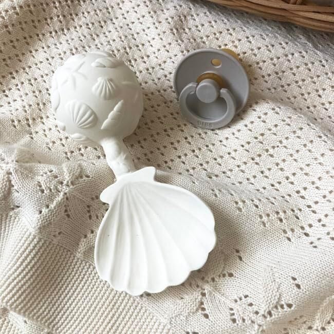 大切な赤ちゃんの手に握りやすいサイズのShellの天然ゴム100%の歯固めにもなるベビーラトルです。
