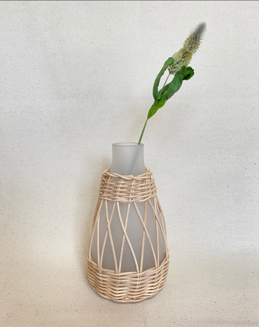 華奢な細めのラタンと白いガラスの組み合わせで、清楚な雰囲気を持ったフラワーベース