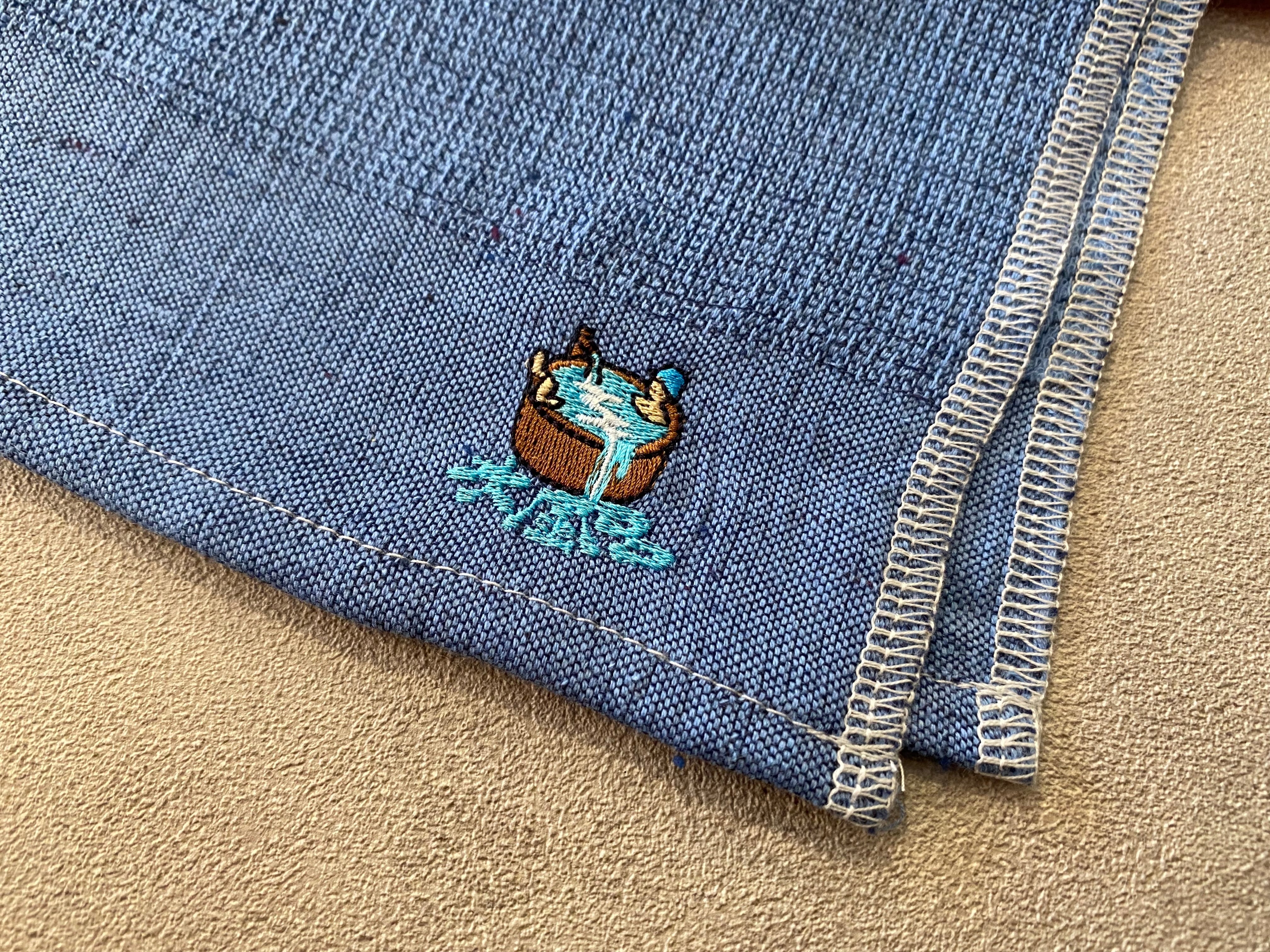 「水風呂」のシーンが刺繍されたタオル、暑いサウナの中で熱を帯びた体を一気に冷やす水風呂。サウナの中でこの水風呂刺繍のブルーのタオルを見れば、その気持ち良さをイメージしながらもう一息暑さに耐えられるかもしれませんよ!!